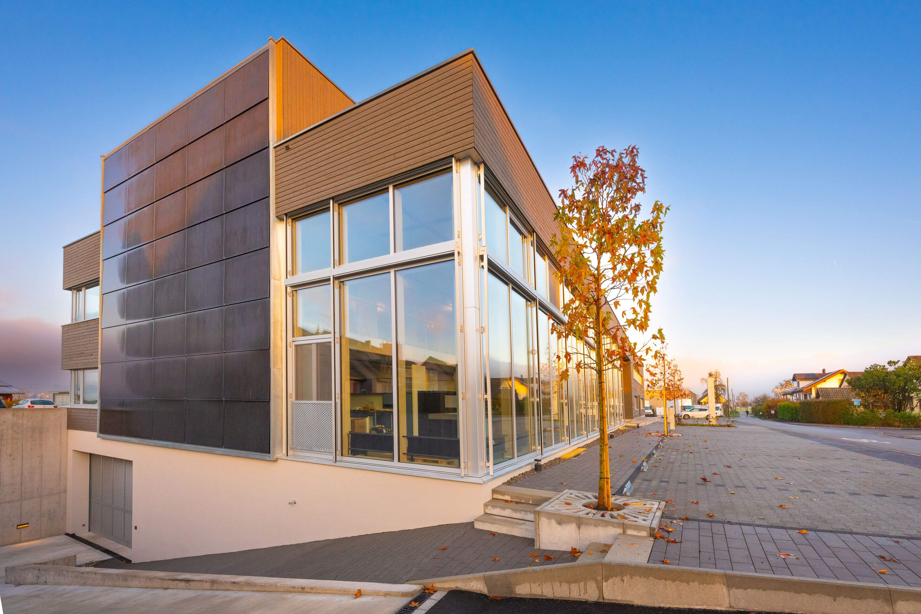 Eine grosse verglaste Gebäudefassade gewährt einen optimalen Blick in die Ausstellungräume einer Schreinerei. Die Pfosten-Riegel-Konstruktion ist mit Holzmetall-Festverglasungen und Oblichtern zum Lüften ausgestattet. Die aussenseitige Aluminiumhülle der Faco-Verglasung ist somit ideal vor Witterungseinflüssen geschützt. Die im Gebäude integrierten Gewerbe- und Büroräume erhielten ebenfalls Holzmetall-Fenster.